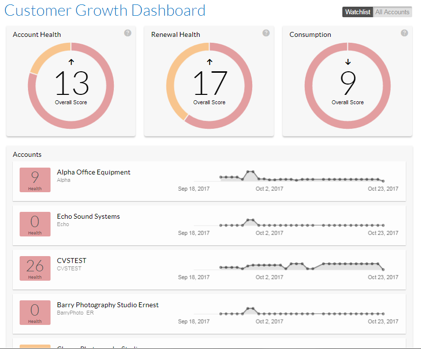Tip:The Accounts list on the Customer Growth Dashboard page shows either all accounts or watched accounts. When showing all accounts, the Accounts list shows any watched accounts at the top of the list.